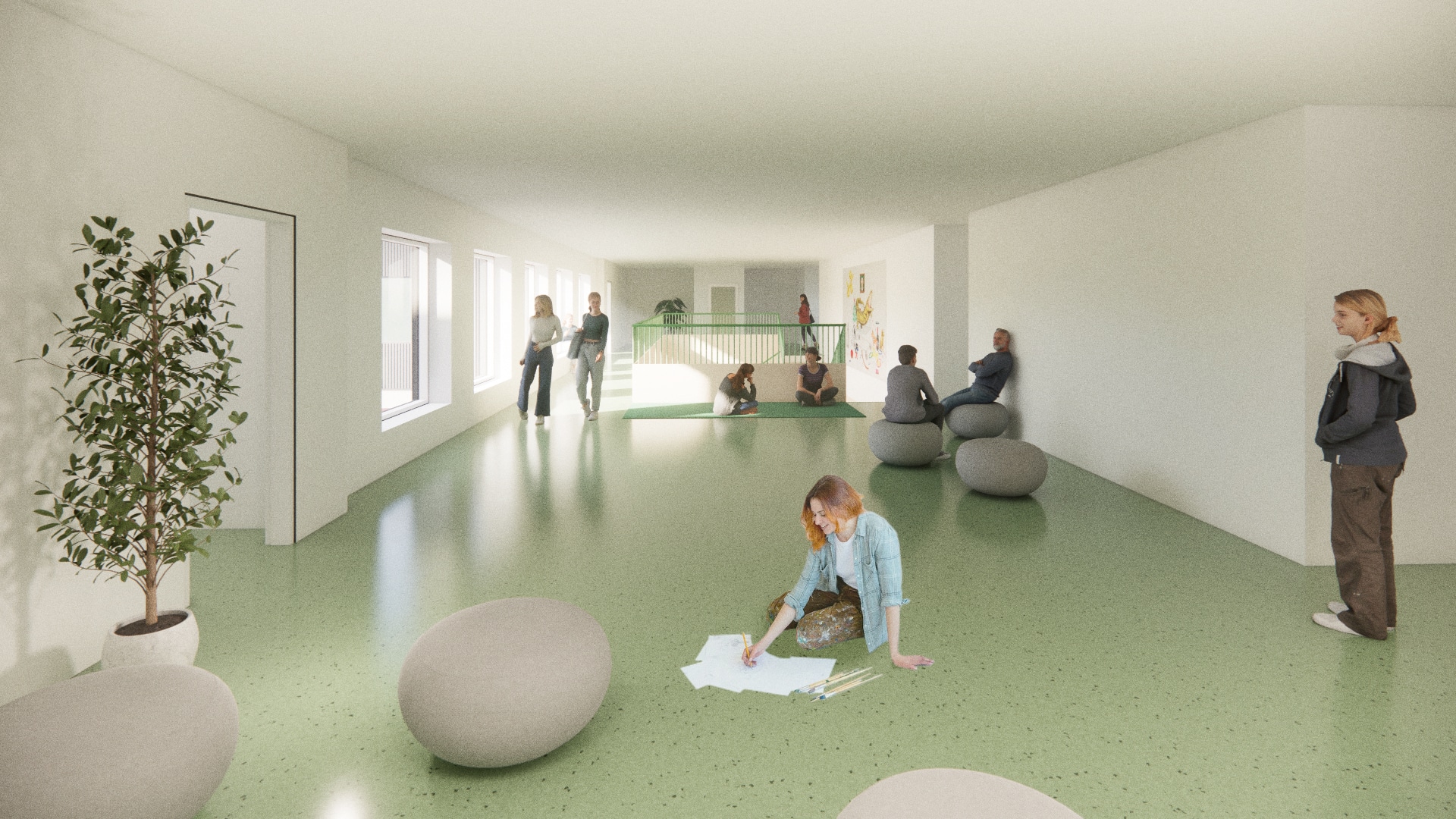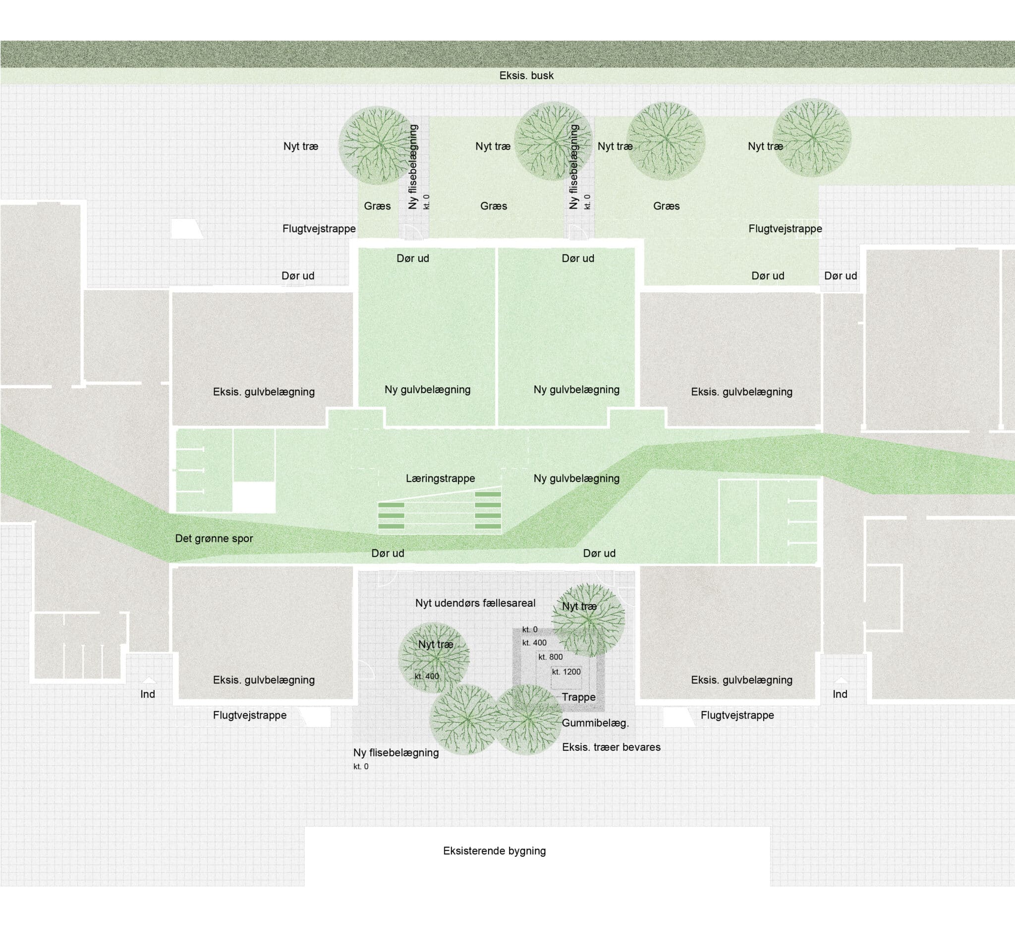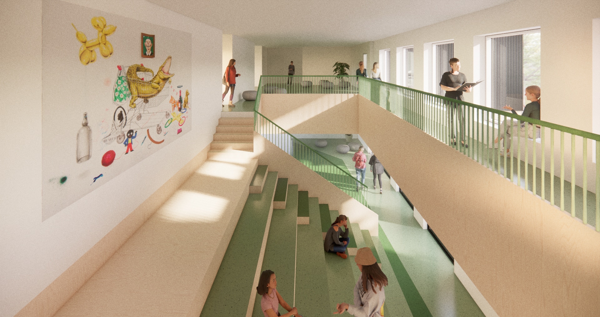 Fra bygning C bevæger man sig gennem et nyt fællesområde med kroge og læringszoner, videre gennem en smallere passage med toiletter og ind i et større fællesrum med den centrale læringstrappe. Herfra er der adgang til både gårdrum og klasselokaler i stueplan. Det grønne spor i gulvbelægningen markerer forbindelsen mellem de eksisterende og nye områder og fortsætter op ad læringstrappen til 1. sal, hvor det binder bygningens niveauer og identitet sammen.