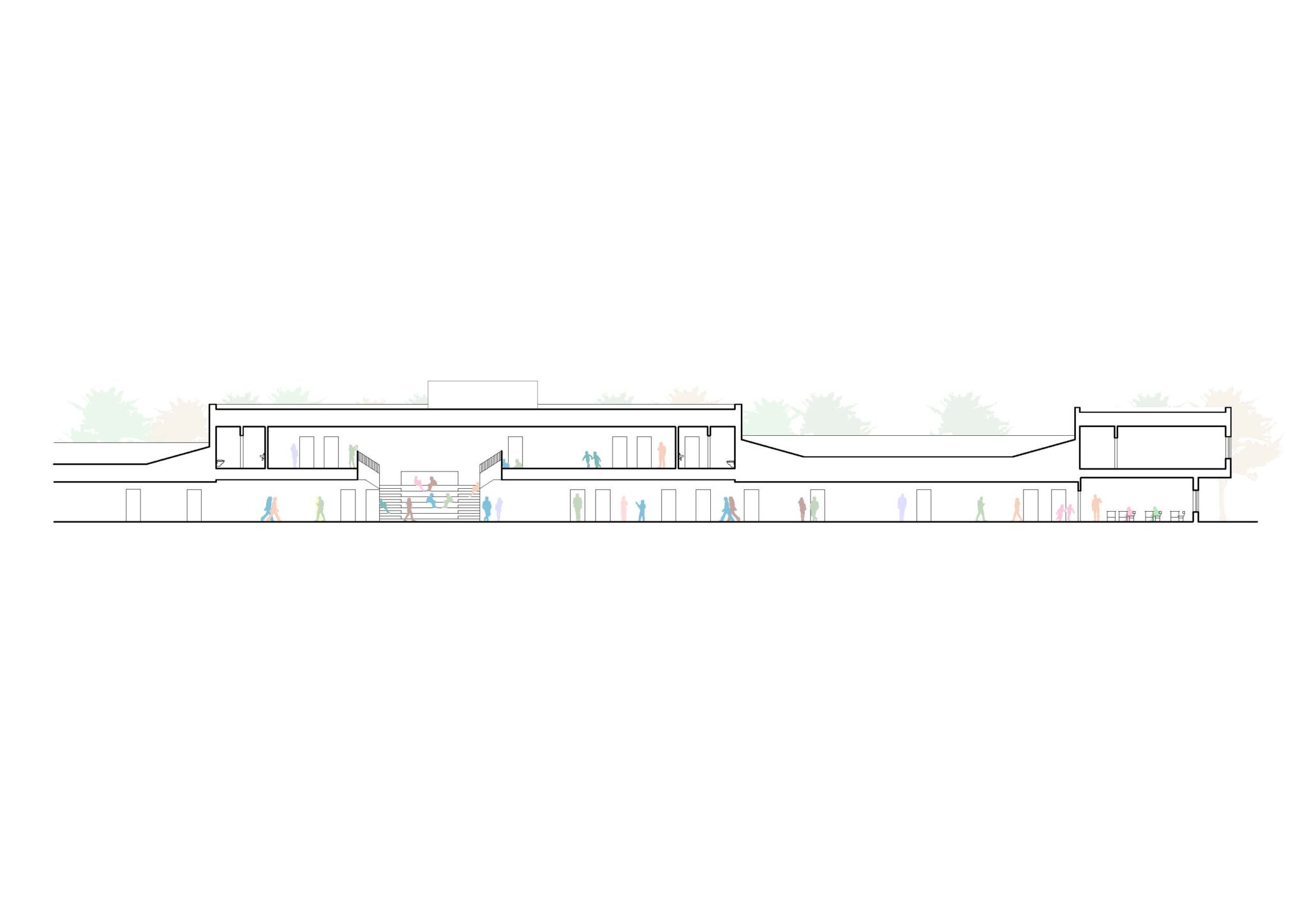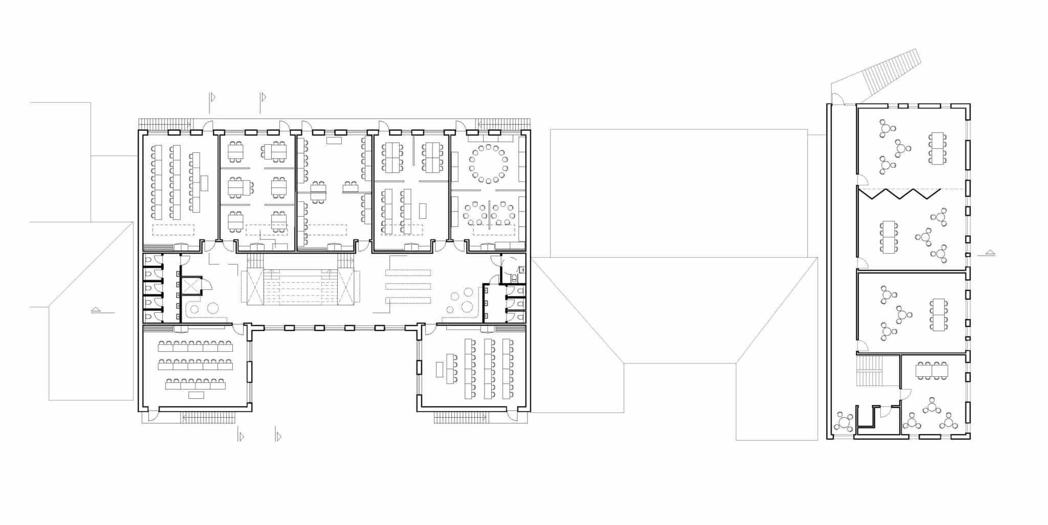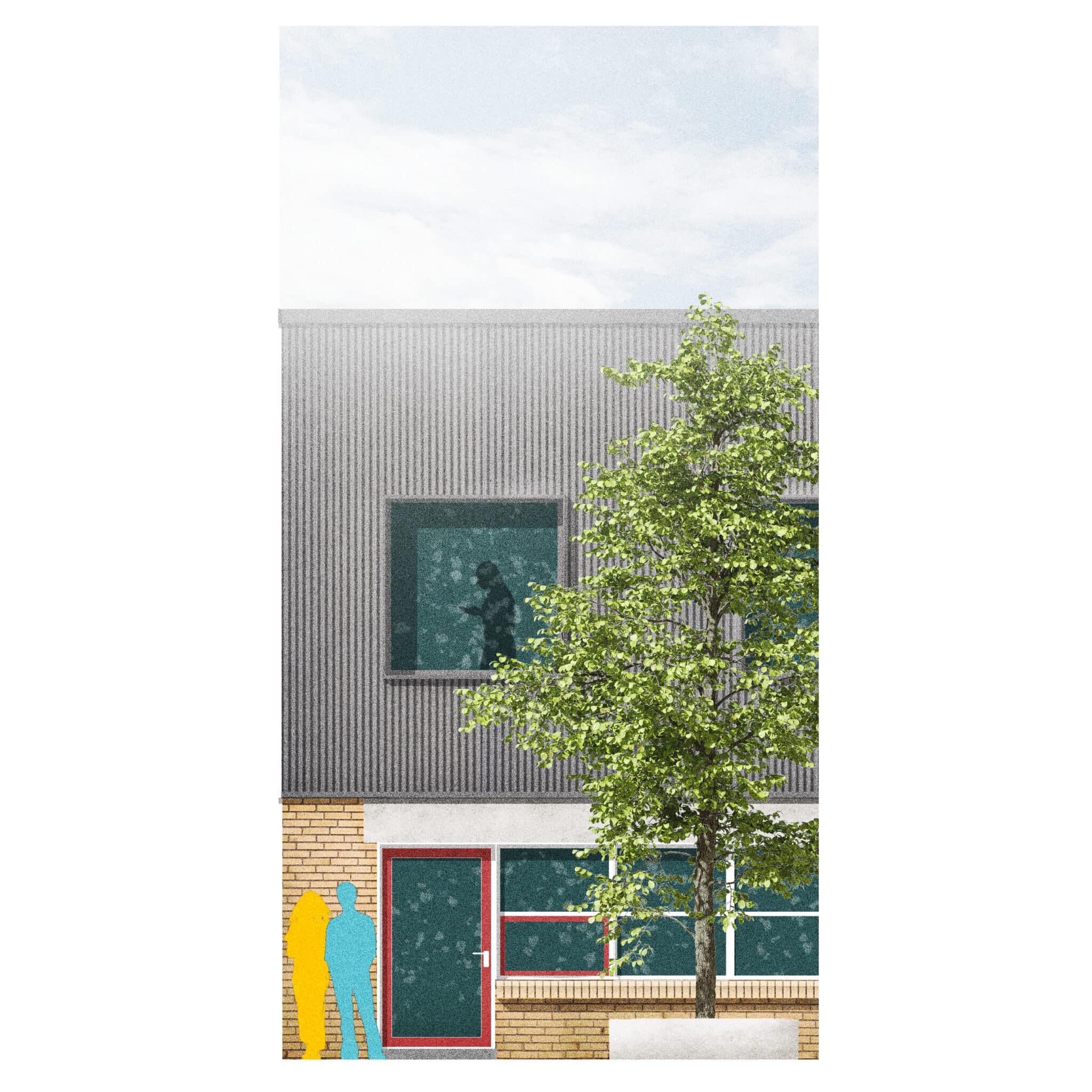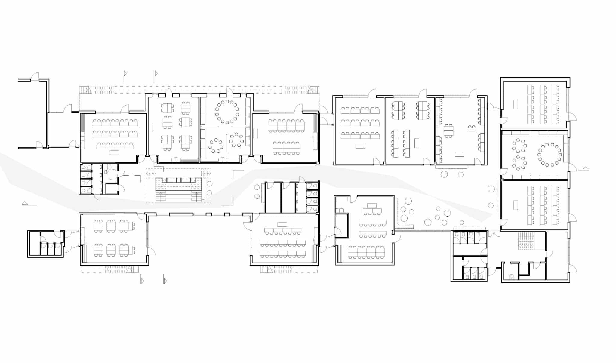 Med udgangspunkt i den eksisterende skoles skala, materialer og rumlige kvaliteter skaber vi en tilbygning, der understøtter et moderne og fleksibelt undervisningsmiljø, og som naturligt tilpasser sig mellem de eksisterende bygninger. Tilbygningen viderefører skolens materialitet og rytme og danner med sin hesteskoform et afgrænset uderum, hvor skolearbejde, socialt samvær og ophold kan foregå. Bygningen opføres i to plan og forbindes indvendigt af en stor læringstrappe, der fungerer som både opholdszone, undervisningsrum og samlingssted.
